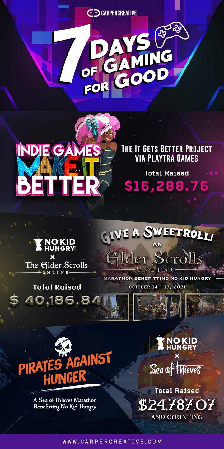 Working directly with the Elder Scrolls Online at Bethesda to bring this event to life, this weekend event featured a relay of official ESO streamers and a bevy of supporting streams from other volunteer content creators. The ESO team also contributed prizes and incentives and a generous direct donation. All proceeds benefitted No Kid Hungry’s efforts to fight childhood hunger.